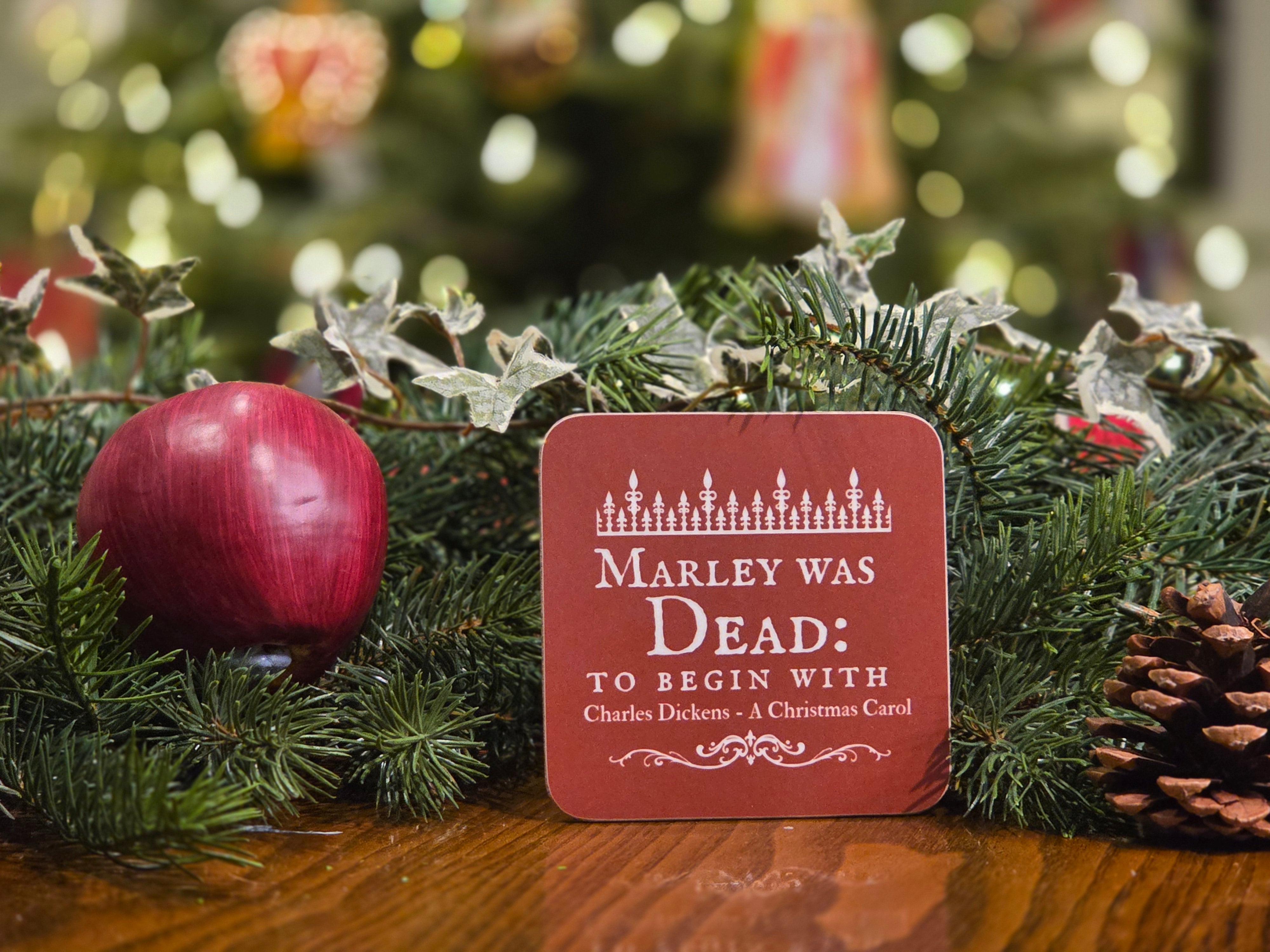 This beautiful cork coaster, inspired by the railings of 48 Doughty Street, depict the famous beginning of 'A Christmas Carol,' published in 1843.